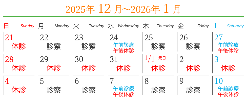 HOME お知らせ 年末年始休診のお知らせ 年末年始休診のお知らせ 2025年12月29日(月)から2026年1月3日(土)まで年末年始の休診とさせていただきます。 1月5日(月)から通常診療いたします。 ご不便をおかけいたしますが、よろしくお願いいたします。